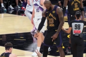 GIF-里夫斯投进3+1后 詹姆斯庆祝