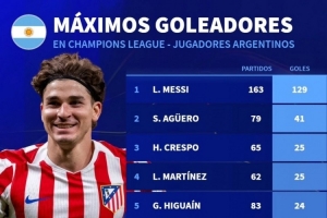 体育资讯11月28日讯 德国转会市场统计了阿根廷球员在欧冠比赛中的进球数量,并列出榜单,梅西129球居首,阿圭罗次席,阿尔瓦雷斯18球第9。