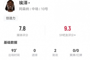 体育资讯2月16日讯 阿森纳在本轮足总杯对阵维冈竞技,埃泽本场数据如下: