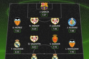 体育资讯2月17日讯 西甲第24轮战罢,数据网站Whoscored也评选本轮西甲评分最高阵容,具体如下: