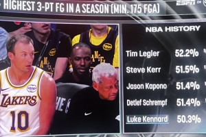 湖人VS尼克斯,转播方晒肯纳德数据,本赛季肯纳德三分命中率已经来到50.3%,能排进NBA单赛季历史前五(至少出手175次及以上):
