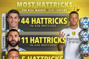 体育资讯11月29日讯 Score90统计了本世纪球员在皇马上演帽子戏法的次数,并列出榜单,C罗44次居首,本泽马11次第二,姆巴佩5次。