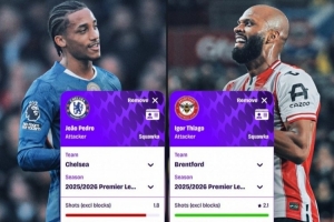体育资讯3月19日讯 Squawka对比了切尔西前锋若昂·佩德罗和布伦特福德前锋伊戈尔·蒂亚戈本赛季的英超场均数据。