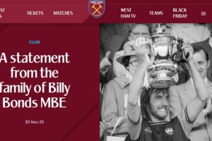 西汉姆联俱乐部怀着深切的悲痛和无比沉重的心情,发布这位传奇球员、教练和主教练比利·邦兹的家族声明:
