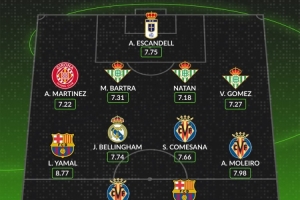 后卫:阿尔瑙·马丁内斯(赫罗纳,7.22分)、巴尔特拉(贝蒂斯,7.31分)、纳坦(贝蒂斯,7.18分)、瓦伦丁·戈麦斯(贝蒂斯,7.27分)