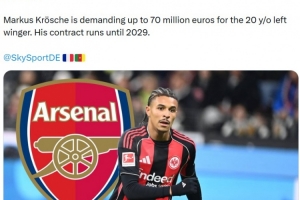 报道称阿森纳已经明确展现出对这位20岁左边锋的兴趣,有意在夏窗引进,法兰克福也对此已经知悉。法兰克福体育总监马克尔斯·克罗斯切对球员要求高达7000万欧元的转会费。