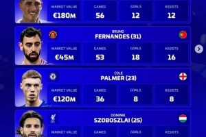 体育资讯12月4日讯 《转会市场》评选2025年最佳前腰(攻击型中场),并列出了4人候选同时对比了他们的数据: