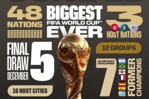 2026世界杯抽签将于12月06日星期六01:00进行,为预热抽签仪式,世界杯官推晒海报盘点本届世界杯的数据: