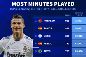 体育资讯12月5日讯 德国转会市场统计了21世纪五大联赛非门将球员的出场时间,并列出榜单,C罗居首,拉莫斯、梅西二三位。