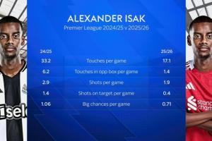 体育资讯12月06日讯 据天空体育数据统计,伊萨克利物浦时期对比纽卡时期,触球、射门等数据均下降。