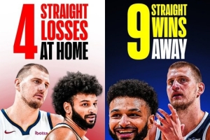 最近4个主场,掘金连续输给公牛、国王、马刺、独行侠。最近9个客场,掘金连续击败国王、快船、森林狼、鹈鹕、火箭、灰熊、太阳、步行者、老鹰。球队目前16胜6负西部第3。