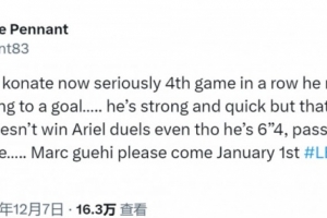 彭南特写道:“我真是受够科纳特了,这已经是他连续第四场比赛犯错导致失球了……他虽然身体强壮速度快,但仅此而已,技术简直糟糕透顶,明明身高1米93却连空中对抗都赢不了,传球水平跟业余联赛球员没两样,格伊请务必在1月1日加盟利物浦。”