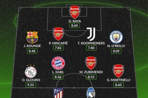 体育资讯12月11日讯 WhoScored根据球员的评分列出了欧冠第6轮最佳阵容,马丁内利、卡尔、孔德、拉亚在列,阿森纳4名球员入选。