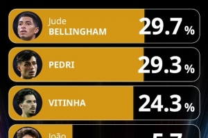 体育资讯12月12日讯 环球足球奖公布了年度最佳中场的投票情况,贝林厄姆居首,佩德里次席。