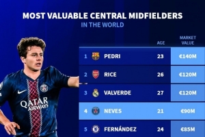 体育资讯12月13日讯 德国转会市场统计了中场中路球员(CM)的德转身价,并列出榜单,佩德里1.4亿欧居首。