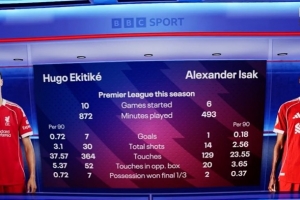 以下为利物浦两大锋线新援埃基蒂克、伊萨克本赛季英超数据对比,具体如下(括号内为每90分钟数据):
