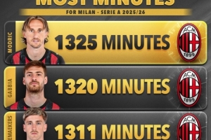 体育资讯12月15日讯 Score90统计了米兰球员本赛季意甲出场时间,并列出榜单,40岁莫德里奇1325分钟居首,他仅有25分钟未在场上。