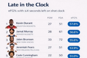 数据美媒Automatic则转发了一则赛前的数据:本赛季至今,进攻时间最后4秒以内的有效投篮命中率排名前十,杜兰特57.8%力压穆雷、布伦森排名第一!
