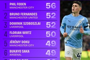 体育资讯1月6日讯 Squawka统计了英超球员本赛季各项赛事创造机会Top10,福登56次居首。