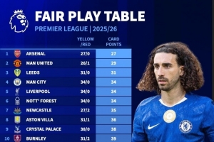 本赛季英超红黄牌积分:阿森纳27分最少,切尔西69分最多