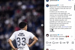 体育资讯1月18日讯 桑托斯19岁左后卫索萨即将加盟热刺,他在社交媒体上发文,与桑托斯告别。