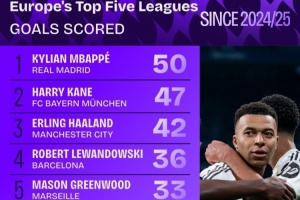 1.姆巴佩(皇马),50球