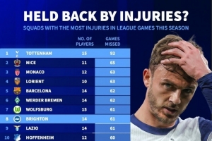 本赛季五大联赛累计伤缺场次榜:热刺92场最多,巴萨62场第五