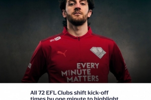 在2月5日至9日期间,英格兰足球联赛(EFL)的72家俱乐部将把36场比赛的开球时间推迟一分钟,以提醒人们在进行心肺复苏术(CPR)时每一分钟都至关重要。