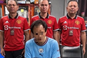 泰国曼城球迷涉毒被捕,警察穿曼联球衣拍照:曼彻斯特是红色的