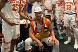尼克斯战胜篮网,赛后球队评选哈特当选本场最佳防守球员,他在更衣室穿工地服装和帽子与队友合影。