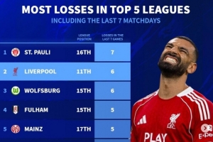 体育资讯11月26日讯 利物浦在本轮英超主场0-3惨败诺丁汉森林,延续了近期糟糕表现,《转会市场》也统计了五大联赛近7轮输球最多情况,利物浦位列次席。