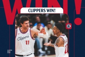 赛后快船官方发布赢球海报,封面为洛佩斯和乔丹·米勒击掌瞬间。